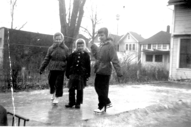 Each winter, sometime after Thanksgiving, Dad began the ice pond. First, he shoveled all the snow from the flat part of the yard until the dark, crusted grass showed. He packed the dirty snow around the edges of the trapezoidal patch. Sometimes we tried to help – a crew of lively elves bouncing around in the mud and muck. Finally, patiently, gently, he began to spray the whole mess with the hose. Layer after layer, the glassy surface froze: a slick, delicious icing that became our pond.