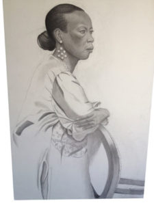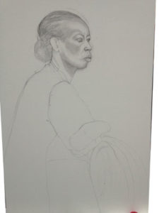 First Postal draws the figure from life using graphite on an Ampersand Gessoboard, initially sketching the whole body, then carefully working on the head, then perfecting the details and proportions of both. The model poses for ten to fifteen 3-hour sessions. Look at her first steps drawing Connie: