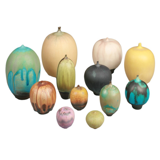 All the feelies are onion-, fig-, or cucumber-shaped vases, never much larger than five inches tall and three or four inches wide, often as small as 1-5/8 x 1-3/8. The globular shape narrows to a closed neck, so tiny it cannot hold anything. Says Cabat of her pieces, “I wanted simpler shapes that went with the glazes … [a] vase can hold weeds or flowers, but can’t it just be a spot of beauty?”