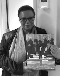 Patricia Spears Jones holding the exhibition catalog from the Jacob Lawrence Migrations Series Exhibition at MOMA in 2015, for which her poem, “Lave” (© Patricia Spears Jones 2015), was commissioned. The Migration Series, a group of paintings by the African American cubist painter Jacob Lawrence depicting the migration of African Americans to the northern United States from the South, was first published in 1941 and funded by the WPA. “Lave” can be found (by permission of Patricia Spears Jones), online by clicking here.