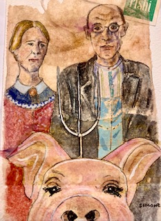 American Piglet,watercolor, gouache & ink on recycled tea bag,