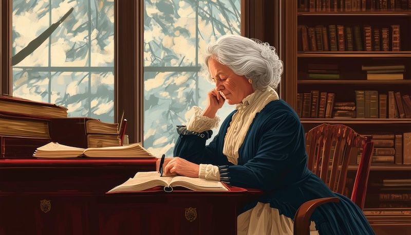 Comparing the mental image of five women working together around that small oval table to one of Thomas Jefferson writing alone on his lap desk as a stagecoach carried him to and from Philadelphia, it’s tempting to conclude, as many feminists would, that women work collaboratively to accomplish their goals while men work individually. Yet, although Thomas Jefferson is considered the sole author of the document that crystallized American resistance to British tyranny (indeed, his authorship is crucial to the legend of his greatness), it is quietly acknowledged that not all of that Declaration was written on his small lap desk and that a few other men—including John Adams and Benjamin Franklin—contributed to the document. Conversely, the story surrounding the Declaration of Sentiments’ composition tilts too far to the side of communal creation. Even if we didn’t know that Lucretia Mott was shocked by Stanton’s resolution concerning the vote, the boldness and brilliance of echoing the structure and language of the Declaration of Independence has Stanton’s name all over it.