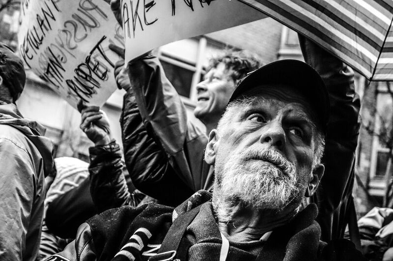 It is a mildly cordial crowd. An occasional, “Not My President” echoed by “Trump, Trump, Trump …” We herd ourselves inch by inch towards the lines that stand at the entrance to the first search point. There are just a few funnels into the tent full of secret service, police, TSA, et al. After one verbal volley, Gene asserts, “I fought for their right to do this.” We express appreciation. My impression of this crowd of 250 people is that only a sprinkling of Inauguration protesters is amongst us. An hour of waiting later, when the “Trump, trump, trump” becomes more provocative, the tiny fire beneath the popcorn of volleys bursts into flame. Protesters are in the majority. Equanimity vanishes. Gene exclaims to my daughter, “I musta killed about 200 Viet Cong. What would it matter if I shot a couple more of these jokers?” A band of authority figures closes down the entrance. We retreat back to the street where we’d emerged from the subway and find another entrance. Police and National Guard and secret service people line the street. The theater continues beside, not within, our contained group of Inauguration goers.