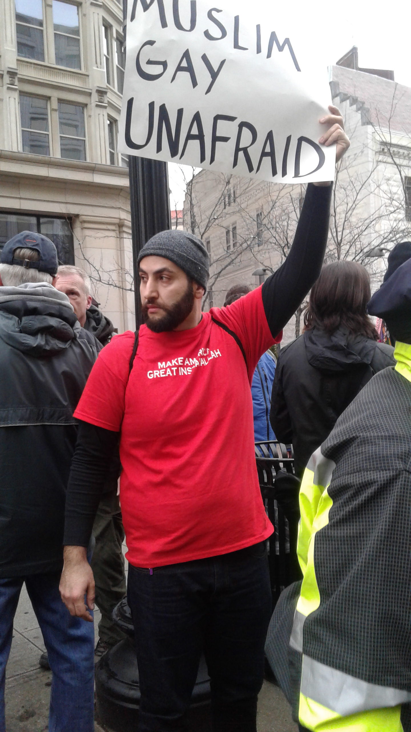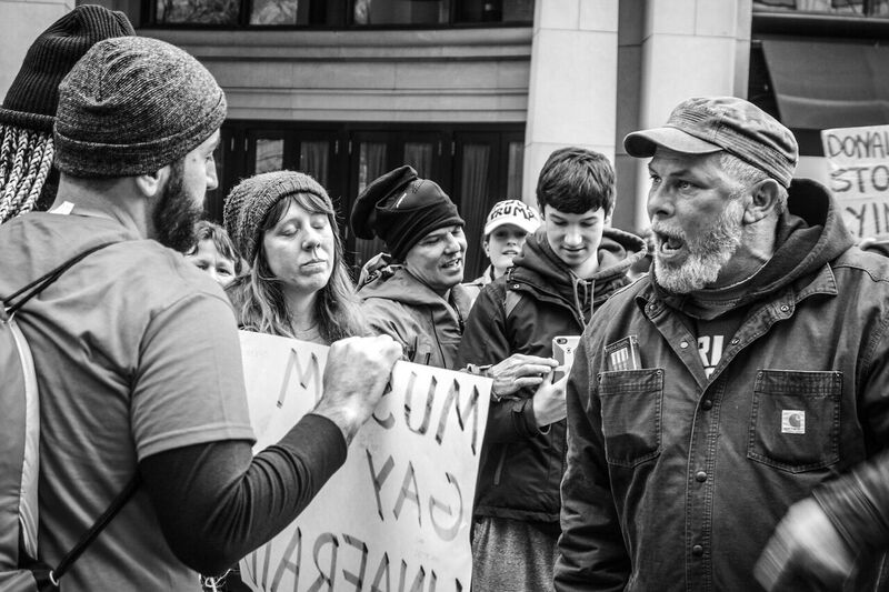 A young man holding a handmade sign with the simple message, “MUSLIM, GAY, and UNAFRAID,” stands boldly beside the metal fence. A teenage boy, looking for all the world like a member of Youth for Hitler, climbs upon a light pole three feet above the crowd and with unremitting enmity, screams, “Trump, trump, trump …” over and over and over again. A big, red-faced street bully wearing loose-fitting shabby jeans lopes towards the fearless gay Muslim and begins to spew the foulest, vilest epithets he can muster. The young man speaks clearly and articulately about what it means to him to be an American. He gives his interpretation of Christ’s message of hospitality. The crowd and police look on, wide-eyed. As the bully draws closer I point to him and scream at the top of my lungs. “You’re making us look bad!” Deep breath. “You’re making us look bad!” Deep breath. “Stop talking. You’re making us look bad!” The bully looks up perplexed as if the thought is sinking in that, instead of being a crowd pleaser, he is bumming out the Trump supporters he is trying to impress. The police step in and with a bit of flailing and a few crude gestures towards my daughters, he swallows his bitter pill and leaves the premises.