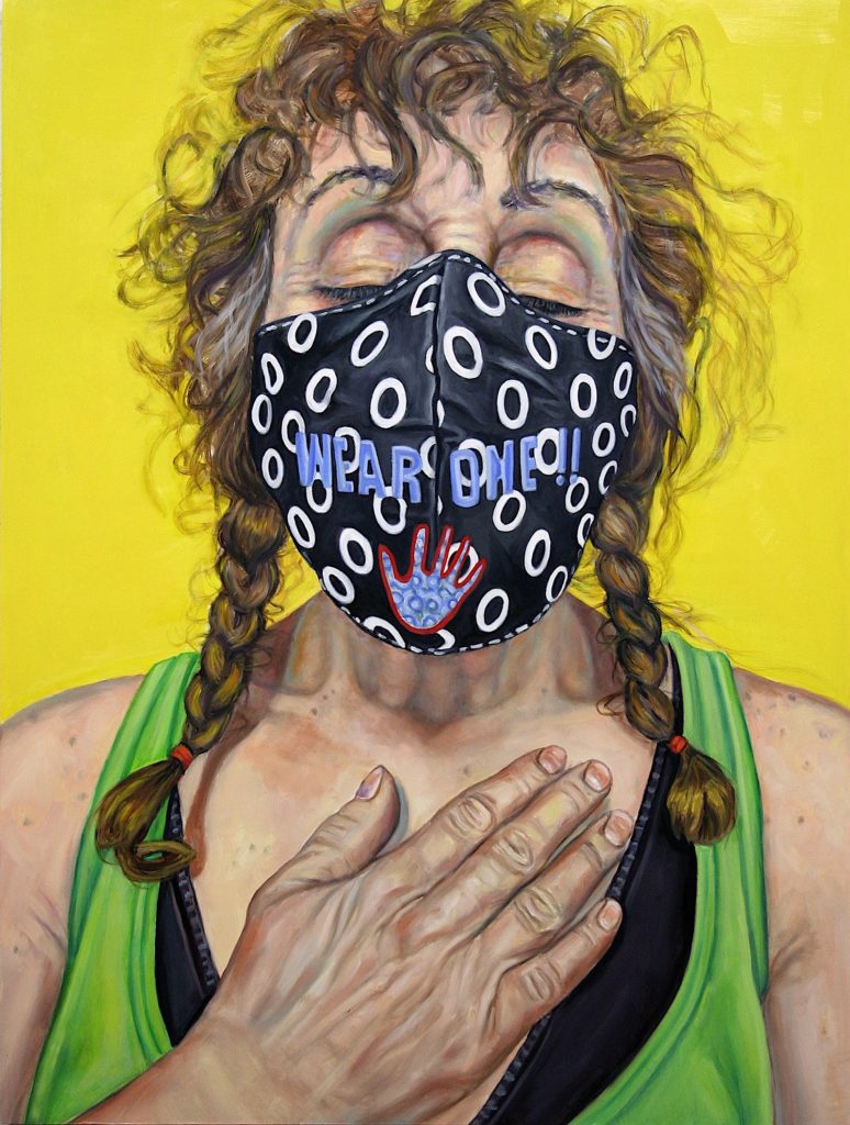 WEAR ONE: 4×3 ft oil alkyd on wood 2020. This very recent self-portrait reveals an anguished Graupe-Pillard, hair tousled, with a bright yellow background and polka-dotted mask.