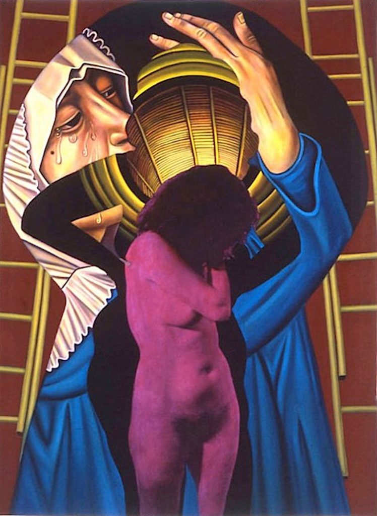KEYHOLE SERIES: GRACE WEEPING VIRGIN (ROGIER VAN DER WEYDEN): oil/alkyd/canvas, 1995. Early intervention into masterwork plus self.