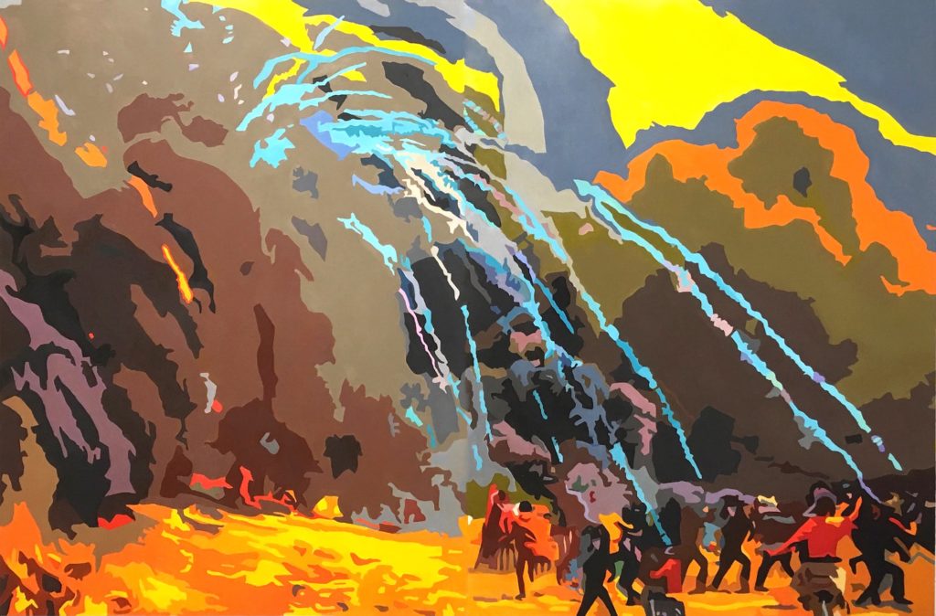 REFUGEES III: 90×60 inches. oil/alkyd/canvas 2003. Brilliant, jigsaw-like, colorful, chaotic; political, but … reminded me of Jacob Lawrence (whom she loves).