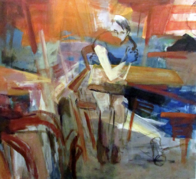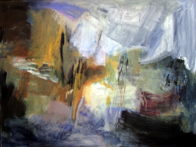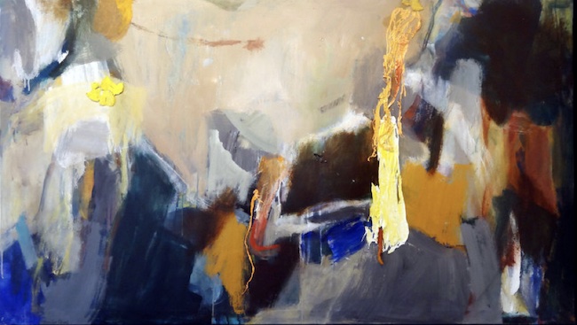 “Edge of Silence, 38” by 56,” is a large, poetic fantasy in which the artist blends blues, oranges, yellows, and shades of white and beige. Skeins of thin paint interrupt the flowing paint in places. Imagination is key here.