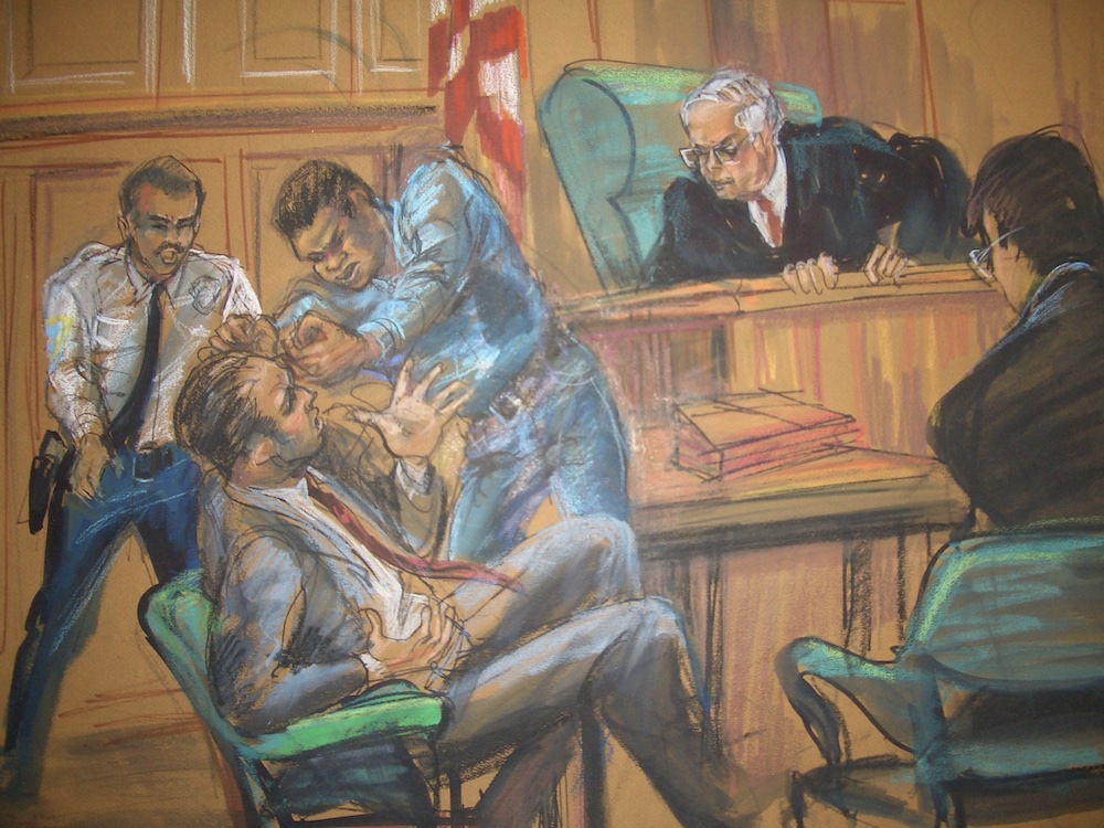 Church told me that when she started out, she had hoped to be an artist but needed a “day job.” Starting out as a fashion illustrator, she became bored. Since fashion illustration demanded a quick hand to draw models moving along a runway, someone suggested to the artist that she might be adept at courtroom drawing. That proved a far more exciting vocation for the artist.