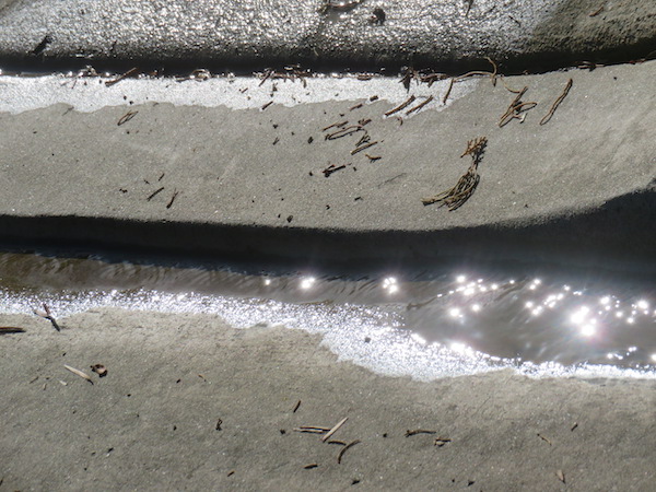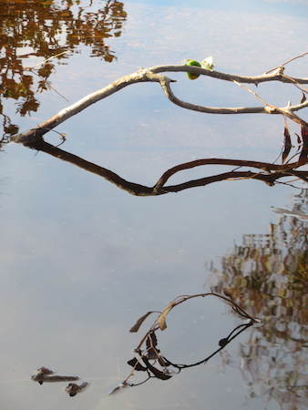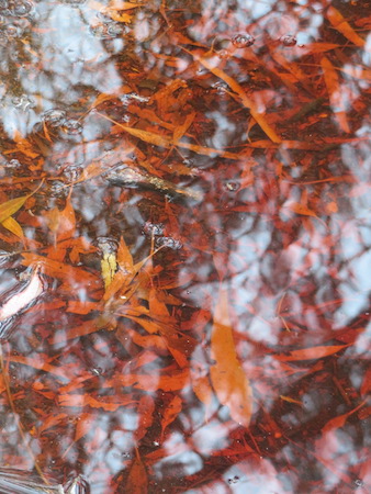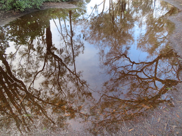 Oh, how the water magnifies, glorifies, earth and leaves and twigs—and trees in reflected spheres. All inspire a kind of surface tension on my mind; my thoughts bloom. Drops and droplets, puddles and pools, lead me on to yet more rain-change, all revealing “something rich and strange.”