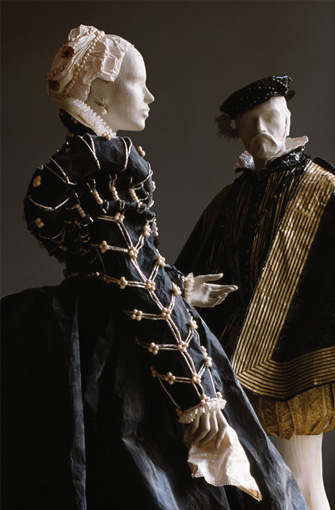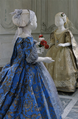 All her outfits are life-size. They are painted and pleated, intricate and sumptuous, full of elaborate velvets, needlework lace, ropes of pearls, and complex coiffures. You can almost hear them glide or rustle and swish.