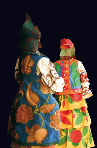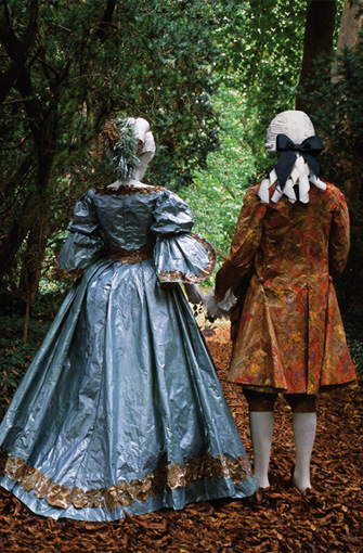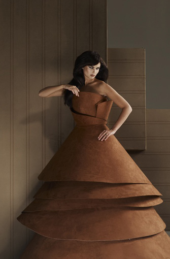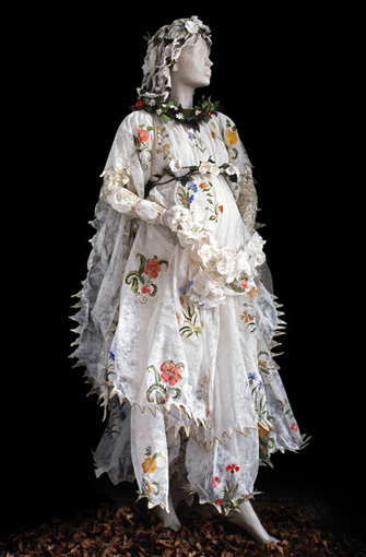 Her costumes are inspired by historical figures, paintings, even famous couturiers. They can evoke the streets of Florence at the time of the Medicis, 19th-century Venice when Mariano Fortuny was designing, or the elegance of Jackie Kennedy. Commissioned to recreate Jackie’s wedding gown for the John F. Kennedy Library and Museum in Boston, de Borchgrave said of the original, “It was dusty and fragile, wrapped up in black tissue paper. The silk was dead, you couldn’t touch it any more. It was preserved like a relic. The original is dead, but the paper one brings it to life again.”