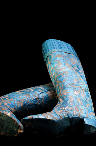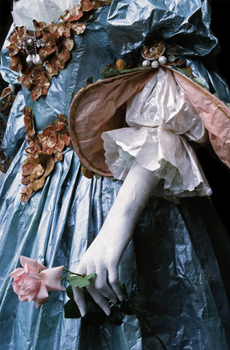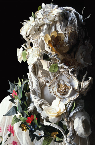 In 1994, the artist Isabelle de Borchgrave dreamed up her paper costumes. Every piece begins with sheets of paper one meter by one and a half meters (3.3 feet by 4.9 feet). On an enormous linen-covered table in her studio in Brussels, she sets to work with tubes of paint, boxes of pastels, sheaves of brushes of all sizes and all kinds of glue. She is the mistress of trompe l’oeil. Givenchy describes her process like this: “With a single sheet of paper, she creates the most beautiful dresses, the finest costumes, or, simply, a chain of white roses … Whether it becomes a shoe, a hat or a few strings of pearls, [Isabelle plays] with paper as a virtuoso plays an instrument.”