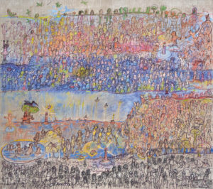 Liliana Golubinsky uses paint, pastel, collage, and black and white imagery to tell stories about politics, love, brutality, childhood, loss – the human drama. Her style is reminiscent of the cartoon-like characters of Philip Guston and Jean Dubuffet. The canvases are brimming with soldiers, toys, lovers, and even buildings blowing apart. The whimsy and animation swirl off the page. The ironic depiction of adult subjects in these alienated beings are represented in incongruent micro-stories softened by being presented as fables and dreams from childhood.