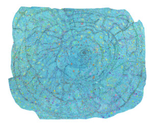 Circles became a major element of her work early on, as they continue to be. She punched holes in manila files, spraying paint through them. The circle is, indeed, a kind of metaphor for her work and life, as she has circled back and forth through styles, subjects, and layers; unsurprisingly, she loves Seurat. Going from grids to circles, collecting cuttings from mats MoMA threw out, and using hole punchers and the chads for layers constituted a kind of “play aspect” of her work.