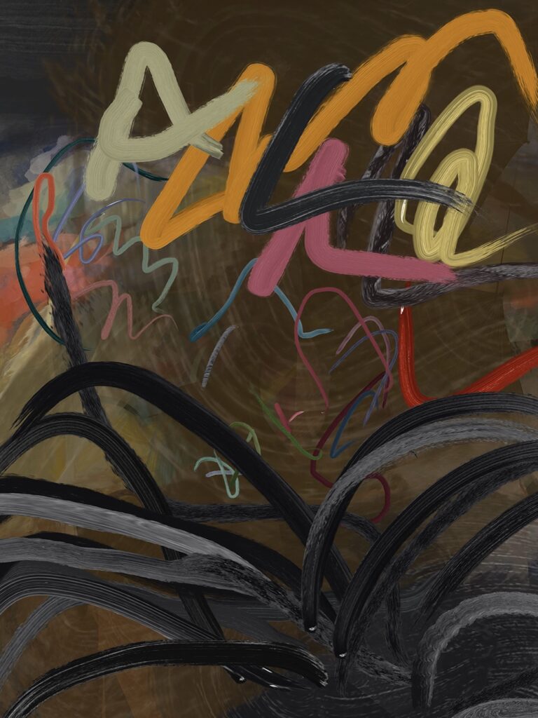 In the digital work Wandering through My Landscape—one of the artist’s newest creations— we see zigzags, commas, layering, brilliant colors, and, above all, the movement that characterizes all her art. I would call it a synesthetic worldscape.
