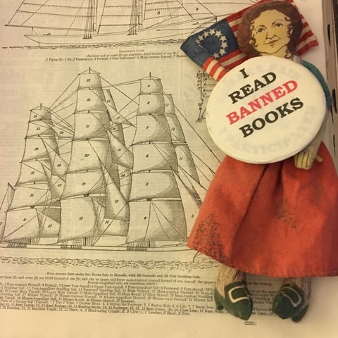 she shares banned books by the escambia seashore, collage 2025 by Flalala Sandytime, composed of artist’s handmade political button, afixed to child’s fabric doll in artist’s collection, placed on previously torn page of a 1940s Merriam-Webster dictionary, a publishing company whose references were pulled from public schools in Escambia County, Florida.