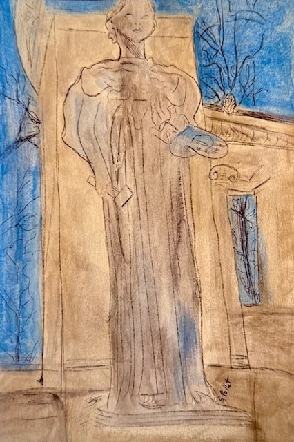 State of the Arts, pen and watercolor by Susan Pollet, New York, NY. This sculpture, located on Fifth Avenue across from the Frick Collection, was carved by Daniel Chester French (famous for the Lincoln Memorial) and installed in 1898. It represents “Painting” and exemplifies the importance of art in our lives.