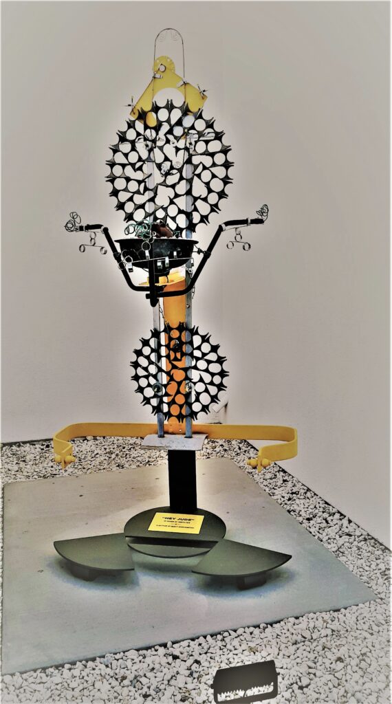 Worthington: “HEY JUDE is a recent outdoor sculpture that I created to honor and pay tribute to the love of my life, partner for 44 years, and soul mate Judith Fein. I wanted to build a relatively large outdoor sculpture that could withstand the elements. I chose to use tough materials, steel, aluminum, durable coated strong wire, lots of rustproof bolts, washers and nuts, and exterior paints. A centerpiece near the middle of HEY JUDE is a copper bowl filled with a thick glass red ball-like object resembling a human heart surrounded by small clear glass marbles … Life ! I wanted to make HEY JUDE strong structurally and visually yet with feminine attachments and embellishments to add a softness to HEY JUDE, as Judith was herself strong and brave yet loving, soft, and kind. … Even though I am at such a loss that she passed away from me, I feel her spirit and I know she is watching over me. When you are walking around the piece and are standing at the back … a hood ornament that I once had on my cargo van when Judith and I were first together is placed strategically there… a woman with yellow wings straight by her sides taking off for a new and wonderful adventure.”