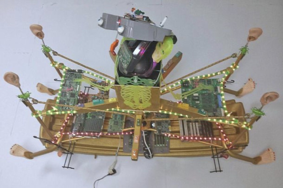 “Civilization!” is inspired by the artist’s fascination with found objects and their relevance to our current society. Worthington sees similarities between  computer circuit boards and aerial views of cities. Anthropomorphic elements of human form are incorporated into the body of the artwork and you will find “pre-civilization” dinosaurs hiding among the circuit boards. Within the sculpture, lights and electricity flow and pulsate. Pushing buttons on the sculpture reveals noises of modern civilization.