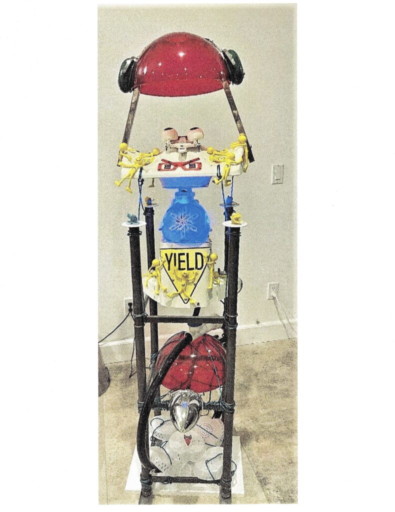 “2020, WHAT’S THE WORLD COMING TO ????” the human condition …bad and good… that tightrope of tragedy and comedy, as I created the comical yet tragic yellow figures climbing and lying all over, menacing frowning angry eyes staring out, the allusion to ventilators around the back of the sculpture, flashing lights , funny signs that say YIELD, a cat wearing a face mask, sound cancelling ear phones…