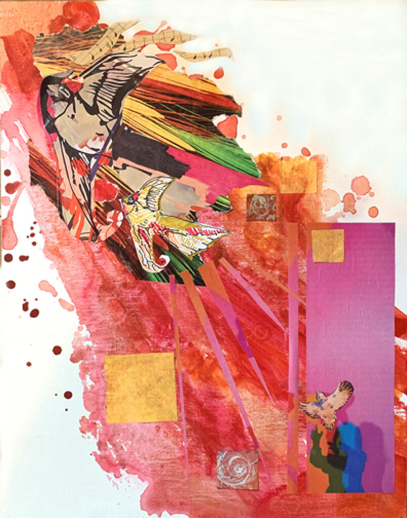 Sing, paper collage on canvas board, by gaye gambell-peterson